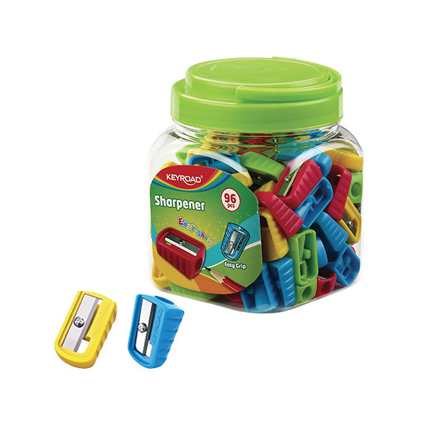 Temperino un foro ultra compatto, utilizzo facile e sicuro. Impugnatura ergonomica antiscivolo. Disponibili in vari colori. Espositore da 96 pezzi.