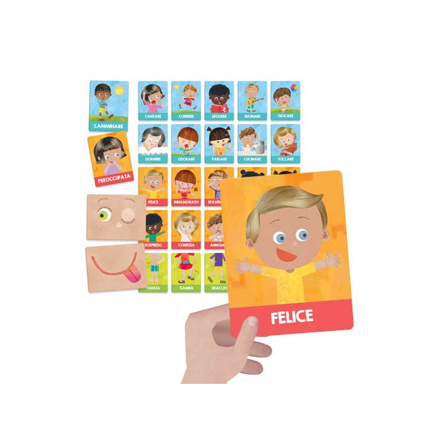 Gioco educativo per insegnare a comprendere le emozioni, l’identità, riconoscere azioni e movimenti del corpo, sviluppare l’autonomia e la personalità, incrementare il lessico, allenare la fantasia.