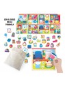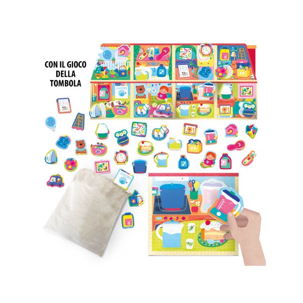 Casetta da ricomporre con 8 cartelle-ambiente, 32 elementi sagomati, sacchetto in tessuto e istruzioni.