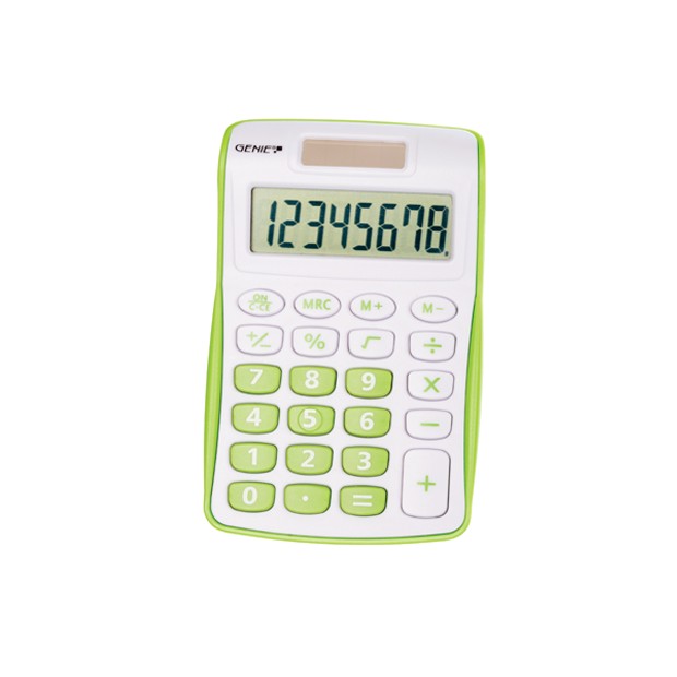 Calcolatrice tascabile a 8 cifre cm. 11x7x2 gr. 55. Doppia alimentazione solare e a batteria. disponibile in due colori: grigio e verde.