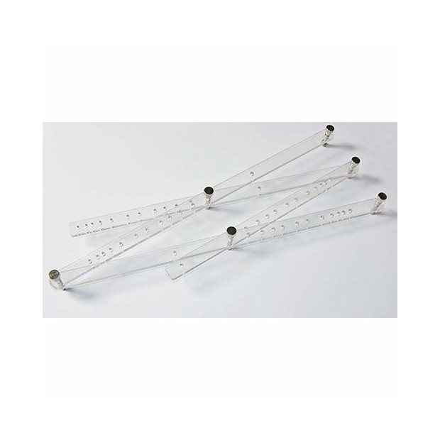 Pantografo utile per riproporre in maniera grafica qualsiasi disegno in scala naturale o ridotta. Con morsetto di fissaggio al piano di lavoro. I valori di ingrandimento o riduzione inclusi nelle aste.