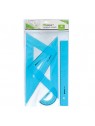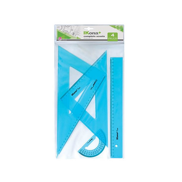 Il set contiene: 1 riga cm.30, 1 squadra cm.25/45°,1 squadra cm 25/60°, 1 gogmometro cm.10/180°