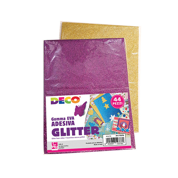 Sagome in gomma crepp glitterata ADESIVE, colori assortiti.