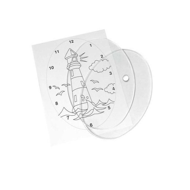 Set per orologi include due vetrini plastici forati già predisposti per posizionare il meccanismo dell'orologio e un predisegno.