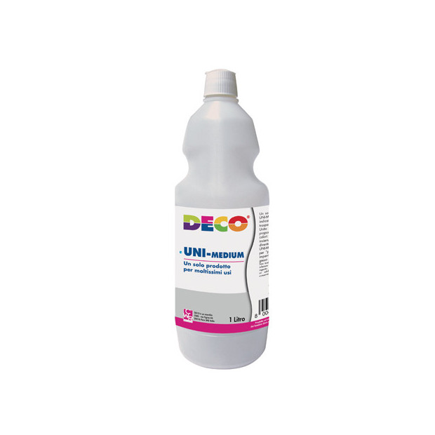 Uni Medium usato da solo è indicato per ottenere superfici trasparenti su ogni supporto. Unito ai colori a tempera in proporzione 1:1 li trasforma in acrilici o per tessuti. Può essere utilizzato anche per plastificare le superfici o impermeabilizzare gli oggetti in gesso e ceramica.