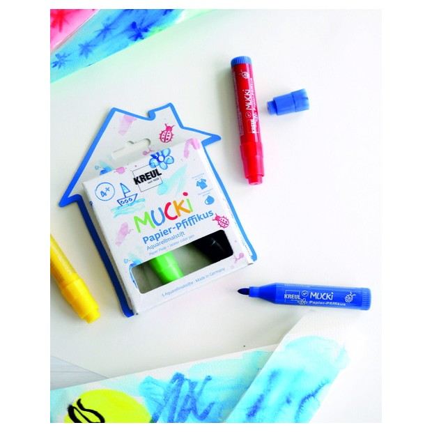I piccoli artisti possono subito dare sfogo alla loro creatività con i marker MUCKI PAPER per dipingere e colorare su carta e cartone, MUCKI TEXTILE per decorare tessuti, e MUCKI PORCELAIN per creare su vetro e porcellana.