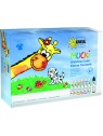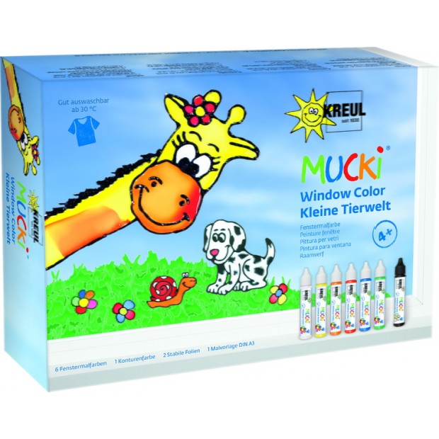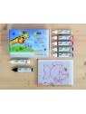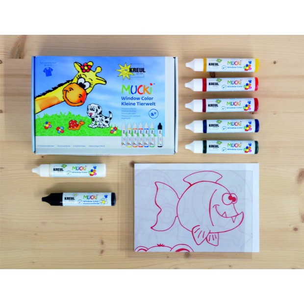 Art. KL 24451: Set MUCKI contiene: 7 penne MUCKI da ml.29 (bianco, giallo, arancione, rosso, blu scuro, verde scuro, nero contorno) 2 fogli di plastica rigida (A5) 1 predisegno A3