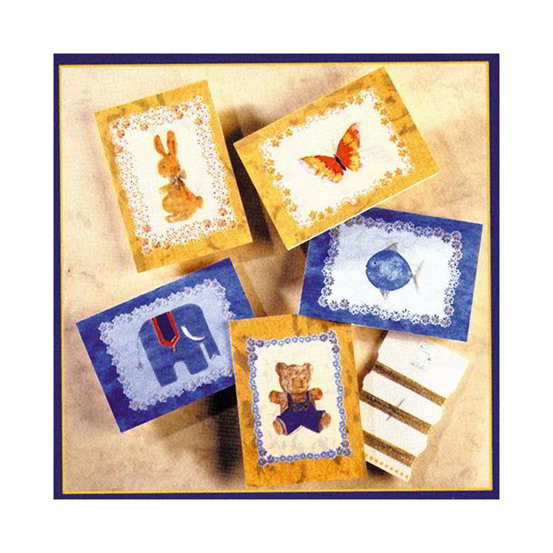 Il set contiene; 5 buste, 5 cartoncini, 5 diversi soggetti predisegnati, 1 ago e i fili necessari.