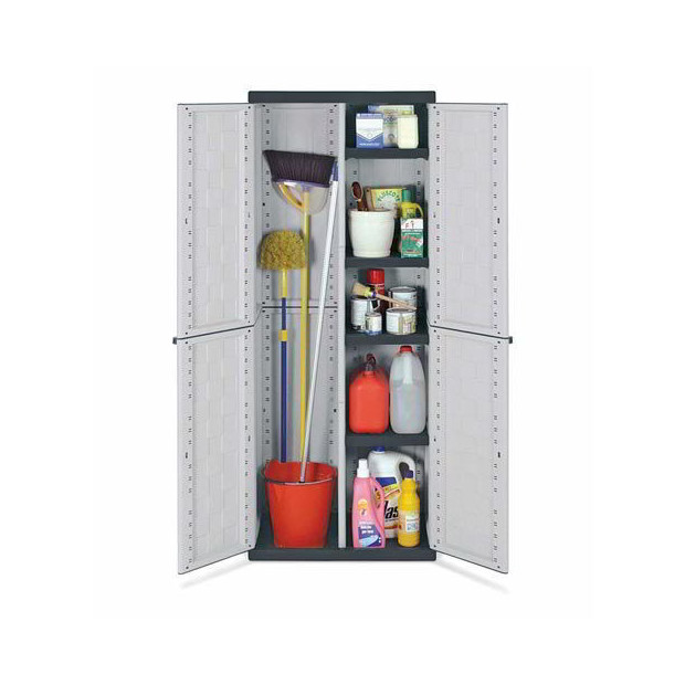 Armadio a due ante in materiale plastico con divisorio verticale e quattro ripiani interni regolabili. Pratica apertura delle ante fino a 180 gradi . Dimensioni: cm.39 x 68 x 166,5 altezza.